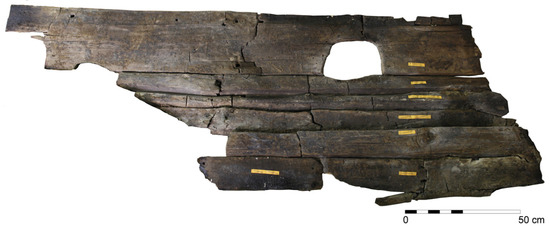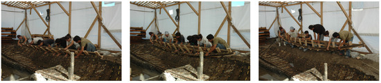 The ceiling planks of shipwreck YK3 were lifted with supports placed on the outer surface of the timbers [22] (pp. 82–85) (Figure 8). Initially, 5 × 10 cm timbers cut in appropriate length and width were assembled at a 90-degree angle using galvanized screws to form “L” shaped wooden profiles. A polyethylene foam layer was stapled into the inner surfaces of the carriers to prevent damage to the original timber. Next, the deposits under the ceiling plank were removed with water, and “L” carriers were placed in the spaces between the floor timbers. This way, the ceiling planks were supported from their lower surface. Furthermore, “L” carriers were fixed to a long wooden board. Finally, each ceiling plank was lifted and placed in its crate.