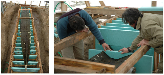 This method was applied for the keel and the three planking strakes on each side of shipwreck YK6 [22] (pp. 88–91). The practices, carried out with the participation of archaeologist Yüksel Dede, started with excavating around the existing hull 1 m wide and 1 m deep. A wooden skeleton with a section of 10 × 10 cm was constituted around the excavated shipwreck. Furthermore, starting from the bow of the vessel, the sand underneath was cleaned in 25 cm sections. The lower and upper forms of the opened part of the hull were copied in a 1:1 ratio with a large-scale profile gauge and drawn on 5 cm of dense styrofoam. Next, styrofoam supports cut with a jigsaw were placed in the gaps under the hull and fixed to the wooden construction. Later, the inner bottom of the hull was supported with styrofoam plates prepared with the same methods (Figure 13). Finally, struts and cross supports were placed on the sides to increase the load-bearing structure of the construction. This way, the hull bottom of the YK6 was lifted as a mass and transported to the tank.