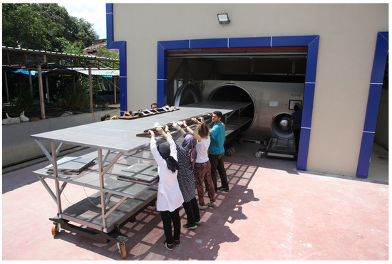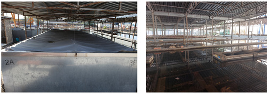 Yenikapı shipwrecks were relatively well preserved in a thick layer of sediment and alluvium that formed due to rapid burial. However, regardless of their fair condition, it is unlikely to store or display any waterlogged ship timber in the museum without conservation and restoration procedures. The biological activity inevitably has caused different levels of degradation on the cell structure of timbers for centuries, even preserved by the heavy mud on them. The conservation procedure was begun immediately as the shipwrecks were brought to daylight [11] (p. 9). The primary works focused on preventive conservation in the excavation site to avoid cracks and shrinkage on waterlogged timbers due to drying out. The excavations started with constructing a temporary tent to shield the shipwreck from external ambient conditions such as sunlight and winds. A water-spray system was installed inside the tent to create an environment of 100% relative humidity and keep the timbers wet for 24 h. During the work on the wrecks, the sprinkler system was operated regularly to prevent the wood from drying out. After the excavation, the timbers were preserved in freshwater tanks constructed of stainless steel and concrete at the Istanbul University Yenikapı Shipwrecks Project Application and Research Laboratory (Figure 14). Desalination and impregnation carried out within the scope of conservation were usually carried out in stainless steel tanks due to their high corrosion resistance [27] (p. 191). One of the biggest problems encountered in the desalination and impregnation of organic artifacts in countries with a temperate climate, such as Turkey, was the activity of fungi and bacteria in shipwreck tanks. To inhibit biological activity during desalination, Acticide SPX (5-chloro-2-methyl-4-iso-thiazolin-3-one and 2-methyl-2H-isothiazol-3-one) liquid biocide was added to the tank at a ratio of 1/1000 [28].