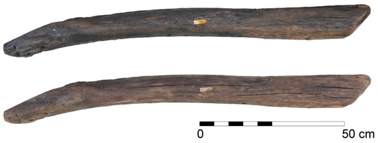 This method aimed to remove the planks while preserving their original shape by copying the inner surface forms of the planks and creating their molds (Figure 11). The internal support method was carried out on the shipwreck YK6, which was first removed from the excavation area [26] (pp. 307–308). First, a template drawing was created by measuring the plank’s length, width, and slope. According to this template, a carrier timber along the direction of the length of the hull plank and intermediate supports fixed perpendicularly to it, spaced 30 cm apart, were prepared. The length of each intermediate support was determined according to its position and the distance from the hull plank to the carrier board. In this way, carrier support suitable for the slope of each plank, which gives the hull form, has been made. Thin boards of 8 mm thickness and 12 cm width were attached to this supporting construction, and a mold suitable for the slope of each plank was formed. Styrofoam plates were placed between this mold and the original plank during assembly. The mold and original plank were fixed with “U”-shaped clamps made of Styrofoam. The Styrofoam clamps, which were placed between 25 cm and 50 cm depending on the deterioration of the wood, were removed after the plank was rotated and lifted from its place.