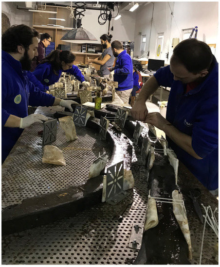 Yenikapı shipwrecks were removed by dismantling, except for the partial mass removal applied to the shipwreck (YK6). The main reason for dismantling was the likelihood of discovering other archaeological artifacts beneath the shipwreck within the harbor deposit and the risk of damaging these artifacts during lifting as a single mass. Another reason was to facilitate the conservation procedures that would be carried out in later stages. Thanks to the dismantling, the fasteners, scarfs, and form of the timbers, which cannot be seen due to the upper elements, were photographed, measured, and drawn. It is of particular importance that the wooden components of the hull are transferred to the laboratory without any damage in their original forms to improve the accuracy of the outcomes achieved in conservation, restoration, and reconstruction procedures. Therefore, during the dismantling of the shipwrecks, broken wooden fragments were connected with steel wires and labeled, reinforcing each one of the members (Figure 5). Dismantling and lifting were carried out using methods developed according to the formal characteristics and degree of preservation of the timbers [23,26]. During the works, the ceiling planks were usually removed first, followed by the mast-step timbers, frames, wales, hull planks, and final keel timbers (Figure 6). The iron and wooden fasteners connecting the timbers were carefully cut at the beginning of the dismantling phase. During the process, scroll saw blades or chisels were used, which were placed between the two elements and moved between the plastic spacer plates that prevent the wood surface from being damaged. Each wooden element removed was placed into a crate. Brass nails and galvanized screws were used to join the woods of chests, which were designed to be placed one on the other. Chests were labeled, indicating the shipwreck’s name and the relevant ship timber’s name and number. The hull timbers were bound to the carrier molds with buckram bands, and their carriers were supported by wedges and fixed to the crates so that the water in the storage tanks was not affected by the buoyancy force. Following the dismantling and lifting procedures, the ship’s timbers in the crates were carried into tanks for wet storage and desalination.