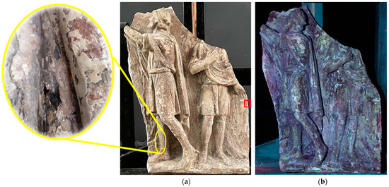 General view of the bas-relief: (a) in visible light; (b) UV photography. Red square marks the area where the probe for cross-section was taken. Yellow sign shows the detailed picture of the marked area.