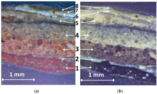 Photofixation in UV light showed the presence of heterogeneous paint layers on the surface of the bas-relief. A cross-section from the surface of the bas-relief (marked by the red area in Figure 1a) was taken and examined using optical microscopy (Figure 2).