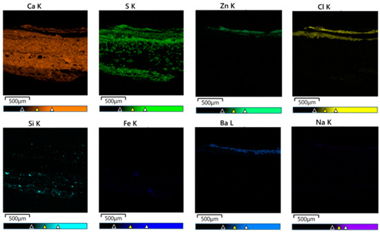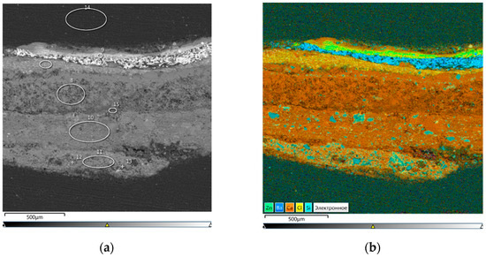 Moreover, the presence of three layers (layers 6, 7, and 8 (about 200 µm thickness)) of white paint on the surface of the bas-relief can be noticed (Figure 2a). The UV image (Figure 2b) also showed different luminescence in the layers of white paint, which provided the prerequisite for studying the elemental composition of the cross-section, which was carried out using a scanning electron microscope.