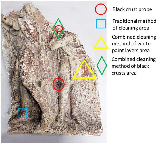 Then, an area of 3 × 4 cm (Figure 5, yellow mark) on the surface of bas-relief, which was covered with layers of white paint, was cleaned (Figure 8).
