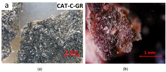 One can notice a similar surface structure and white crystals’ formation on the surfaces of the black crusts shown in Figure 6. The authors of the reference work (Figure 6a) claimed that such black crusts form as a result of the sulfation process of calcite in the open air, when gypsum is formed and continues to react with the environmental S and C. Thus, we may conclude that in our case, we are also dealing with gypsum crusts. This is important from the point of view of the laser source choice, since the Nd:YAG laser with a wavelength of 1064 nm removes black gypsum crusts easily [1,13,22,23].