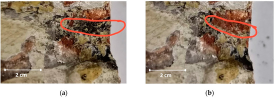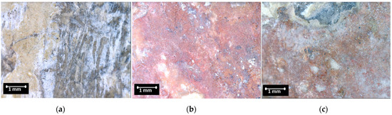 The photographs show that after the combined cleaning method (Figure 9b), the surface had a more pronounced red color compared to the surface cleaned with the traditional chemical method. Whitish traces (Figure 9c) may indicate that a gypsum layer remains, distorting the color of the surface after traditional cleaning.