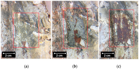 After laser exposure and application of dimethyl sulfoxide (exposure for 10 min), part of the white layers almost immediately began to peel off (Figure 8b), and the remaining area was cleaned with a scalpel and additional treatment with dimethyl sulfoxide (depending on the thickness of the layer) during mechanical action. As a result, the site was uncovered with no visible damage to the historic red paint layer (Figure 8c).