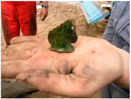 While the written evidence about agents such as women, slaves, and children permits us to reconstruct some narratives to a certain extent, archaeological evidence is more complicated to access. Archaeology has a tremendous difficulty in identifying some aspects of the past, such as the different genders or ethnic backgrounds on board ships, especially when minorities comprised a small percentage of the population onboard. Female objects are normally rare in shipwrecks, and except for some jewelry found in the excavation of the Bom Jesus (1533) [] and the São Bento wreck off the coast of South Africa [], it is difficult to connect any other material evidence to women specifically. The same can be said about slaves. While the cargo destined to be used in their acquisition, such as beads and brass manillas, has been found in Portuguese wrecks (such as at the Cape Verdian wreck Ponta do Leme Velho []), these cannot be connected specifically to their activities on board. As for children, artifacts identified as toys are seldom found in wrecks. The fragments of two ceramic water whistles shaped like horses—regularly identified as toys—were found on board the Bom Jesus wreck (Figure 2) [].