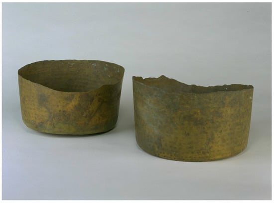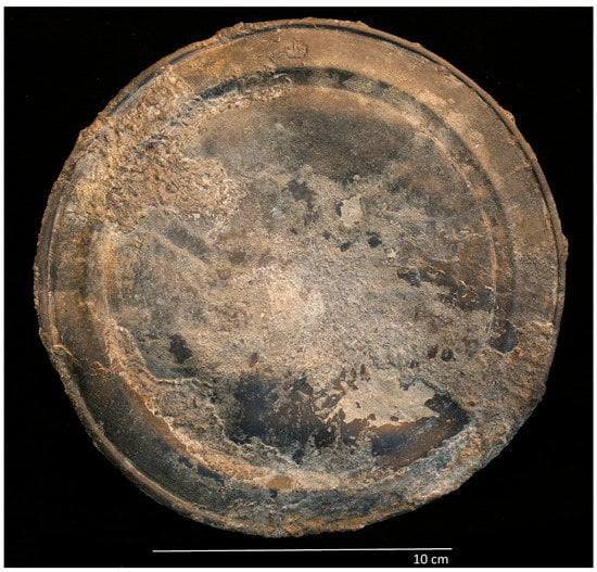 Food was frequently eaten raw. Although this was supposed to happen only when a storm or bad water did not allow for fires to be lit, the few stoves on board were the only source of fire, and sometimes the long lines at mealtimes led people to give up on cooking. The use of fire on ships was a very serious issue, and there were people specifically responsible for its management. Stoves were used in turn and each person, or their servants or slaves, cooked their own food. The ‘stove’ itself was nothing more than a wooden box full of sand where a fire would be made, located below deck until the late 16th century and on the upper deck after the 17th century []; [] (p. 134). Therefore, during high seas, which could last for days, food could not be cooked. The majority of cooking vessels were made either from cast iron or a copper alloy to mitigate vessel breakage. Several such examples were found on the Nossa Senhora dos Mártires and the Bom Jesus (Figure 4) [,].