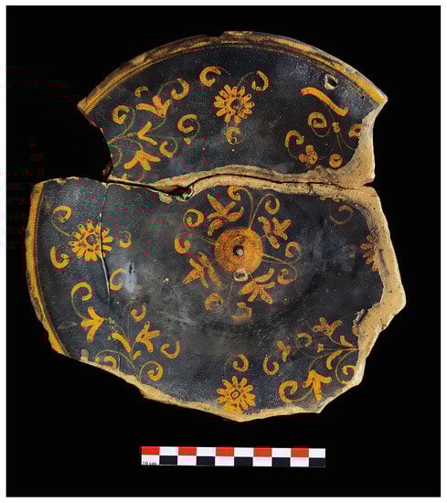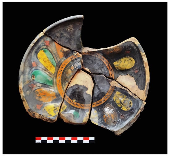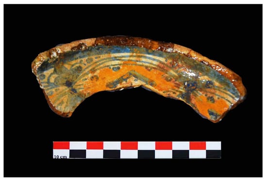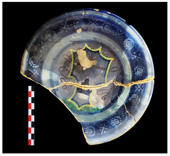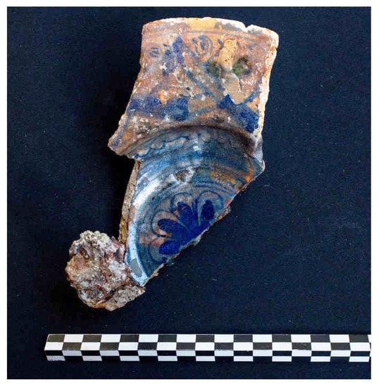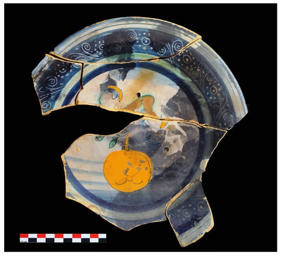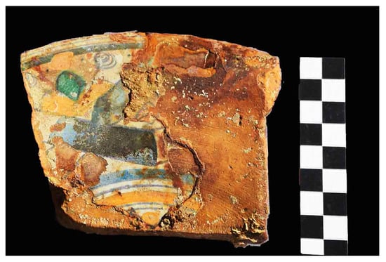 Figure 9). It has large gaps in the tin-glazed layers, and, where residual, the legibility of the colours is not excellent due to alterations as a result of the fire on the ship.