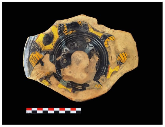 Among the objects, a small plate (diameter at the rim 20 cm), with an inverted rim and a slightly umbonate, sucker-shaped bottom was found (