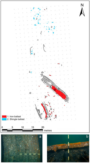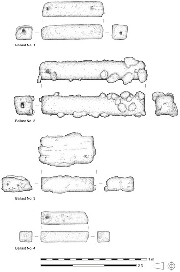 Ballast is a very common find in shipwreck sites. In maritime and nautical archaeology, it has been widely acknowledged that the study of ballast deserves special attention, as its characteristics, distribution, and provenance can yield valuable information for assessing where the vessel was ballasted, sailing routes, ship tonnage, and site formation processes [2] (pp. 413–418); [3] (p. 22); [4] (pp. 131–132). A cluster of stones used as ballast can be one of the few types of evidence remaining from a shipwreck in situ and, thus, can help delimit the place where the ship was lost [5]; also, ballast mounds can help preserve structural remains and other artefacts deposited below them [6,7]. Morphometric and distributional studies of ballast have shed light upon decisions related to the ship stowage and shipping mishaps, among other aspects [8]. Surface marks on ingots, such as the date of manufacture or the foundry’s name, can also prove highly diagnostic for dating and provenance studies [9] (pp. 27–32). Previous studies that combined archaeometric characterisation of stones, coral, and metal ballast remains with documentary evidence have provided new information about the characteristics and service life of several modern European- and American-built vessels [10,11,12,13,14]; [11] (annexe 2, pp. 153–154); see also [1] and references therein.