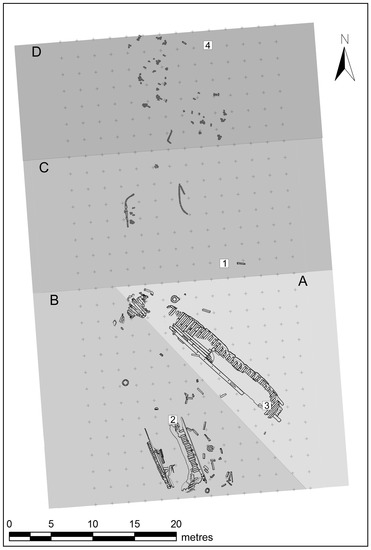 Figure 4. Iron ballast blocks retrieved from Infatigable included in the present study (Nos. 1 to 4). Specimens were collected in areas, A, B, C, and D of the wreck site. The image depicts the 2017 site plan, when most of the samples were recovered (Illustration: Francisca Morales).