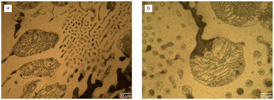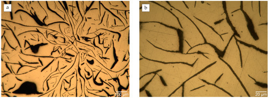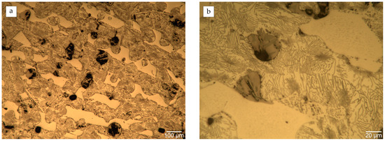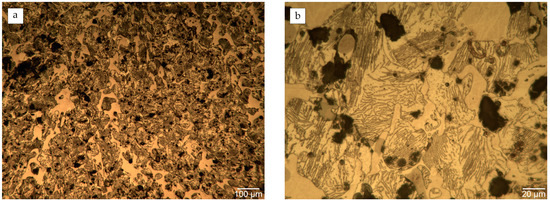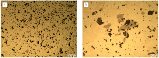 Figure 10. Photomicrographs of the unetched polished surface of Sample No. 2. A high amount of iron manganese sulphides (grey inclusions) can also be observed. Magnification: 100× (a); and 500× (b).