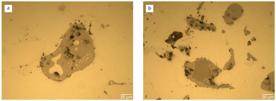 Figure 7. Photomicrographs of the unetched polished surface of Sample No. 1, showing non-metallic inclusions of different sizes (a,b) identified as MnS particles (light grey). Magnification: 500×.