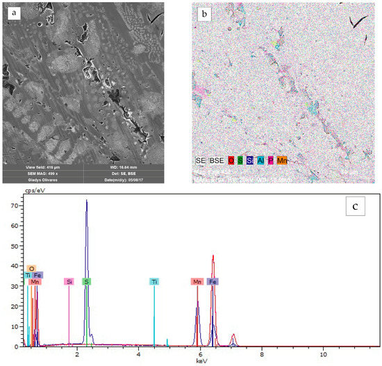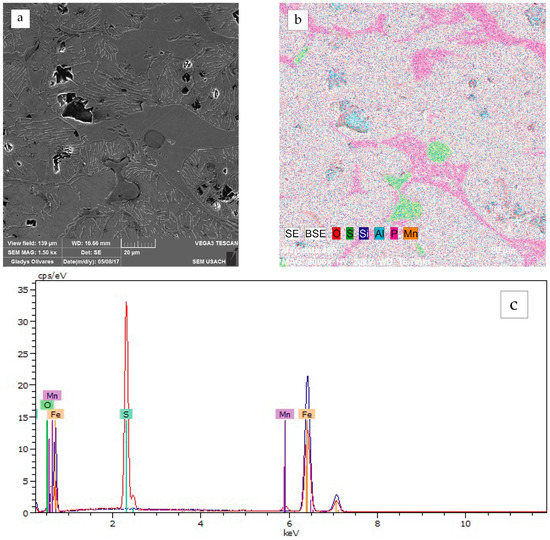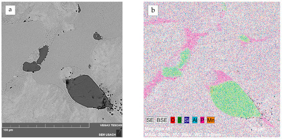 Figure 17. SEM-EDS analysis of the alloy constituents of Sample No. 3: (a) SEM image (SE); and (b) EDS mapping of the area presented in (a); and (c) EDS spectra of microconstituents (blue spectrum corresponds to an MnS particle).