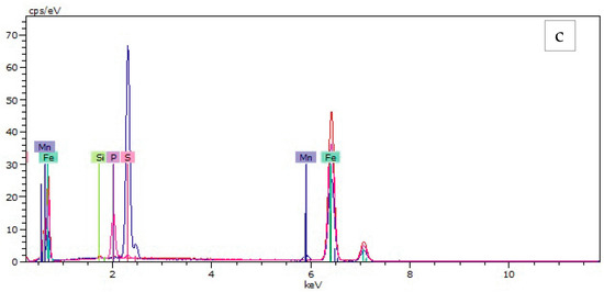 Figure 11. SEM-EDS analysis of the alloy constituents of Sample No. 2: (a) SEM image (SE); (b) EDS mapping of the area presented in (a), where the MnS inclusions are seen in light green, and iron phosphides are in light purple; and (c) EDS spectra of inclusions (red spectrum corresponds to an MnS particle).
