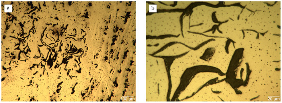 Figure 13. Photomicrographs of the unetched polished surface of Sample No. 4, where lamellar graphite (types A & C) is observed. Magnification: 100× (a); and 500× (b).