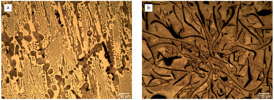 Figure 16. Photomicrographs of Sample No. 4: (a) microstructure of pearlite (light grey) and cementite (elongated white crystals); and (b) amplification of lamellar graphite surrounded by a pearlite matrix. Magnification: 100× (a); and 100× (b). Etching: Nital 2%.