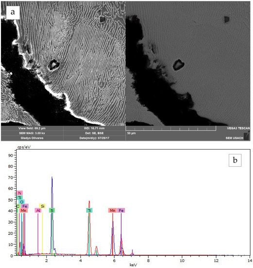 Figure 18. SEM-EDS analysis of the alloy constituents of Sample No. 4: (a) SEM images (SE & BSE); and (b) EDS spectra of MnS and TiN inclusions, which can be observed at the centre and top-right of (a), respectively.