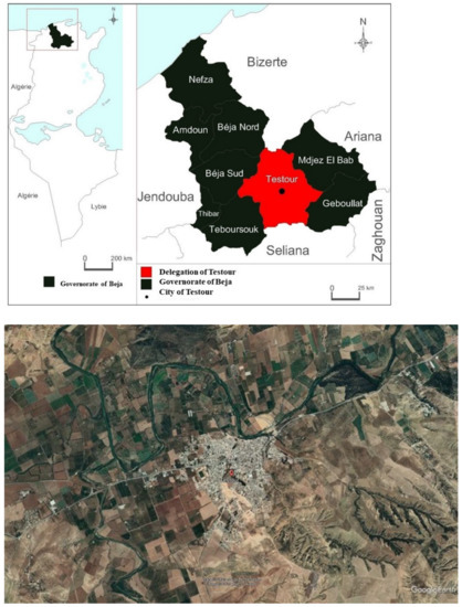 Testour, like many other small Tunisian cities, suffers from serious problems due to a fragmented and dysfunctional urban structure that affects its management. Studies related to the city of Testour have explored the transformations of the city’s peri-urban landscape and found an associated distinct spatial organization [22]. The delegation is situated in the Béja governorate, in the northwest of Tunisia. It is bound on the eastern border by the delegations of Medjez El Bab and Gobelat, on the southern border by the Seliana governorate, on the western border by the Téboursouk and Béja sud delegations, and on the northern border by the Bizerte governorate (Figure 2). The city of Testour serves as the delegation’s administrative centre. The delegation is dispersed across several additional regions, including Ibn Zaydoun, Cité 26 Fevrier, Mzougha, Zeldou, Aouled Slama, Ain Younes, Eskhira, Oued Ezarga, Sidi Abdel Aziz, and Sidi Ameur, in addition to Slouguia, which is the delegation’s second-largest city. Established in the valley of Medjerda, it dominates a vast agricultural plain. The city is located 79 km west of Tunis.