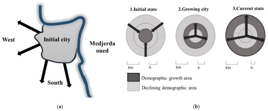 (a) Testour’s urban sprawl directions; (b) Representative diagrams of the relationship between urban sprawl and population growth.