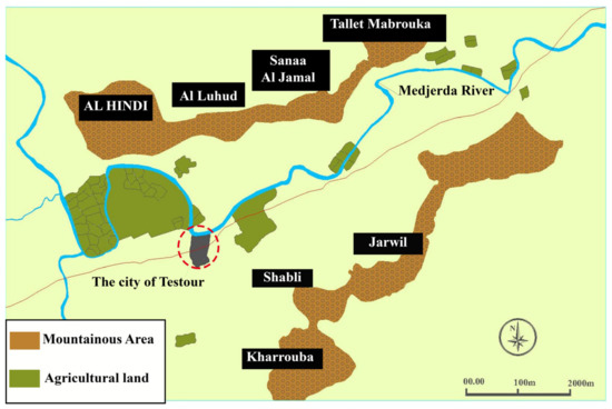 - Testour’s old agricultural lands: The agrarian morphological structure of these former orchard of El Romèn and El Bragiil is characterized by fields blocked in small plots, whose small and medium property and agriculture are traditionally devoted to intensive vegetable and tree cultivation, mainly corresponding to an agrarian system of the enclosure. These are most often irrigated garden crops and are closely linked to the city, providing the bulk of food for daily consumption [22].