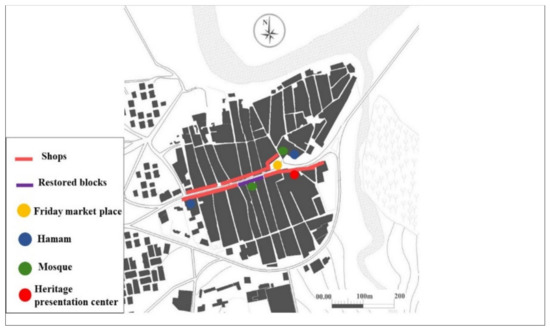 The study of Testour’s urban functionality highlights the importance of the residential function in the first instance. The number of households amounts to 8291 households, i.e., 4.05 persons/household. The number of dwellings is equal to 9384 units, or 0.88 households per dwelling. The old town center, at the heart of urban life, has three relatively wide longitudinal arteries, connected in an orthogonal manner by narrower side streets, delimiting stacked blocks. The main roads include the souk. The souk of Testour has a median road (east–west) with commercial and artisanal activities. It is the main axis of the medina, separating the Hara district from the Andalusian and the Tagarin districts. It also hosts the merchants and traders of a weekly Friday market. Most of the stores appear closely linked to the main religious buildings. The souk of Testour probably dates from the first half of the 17th century. The souk is almost exclusively occupied by stores. Figure 8 shows that no dwelling house comes between the shops. It includes, however, some public buildings, including mosques. Another striking fact about the souk of Testour is the absence of specialization, which is unlike the Tunisian medinas. The city has nevertheless preserved an important commercial activity. Trade, services, and commercial equipment present Testour’s most important activities and are characterized by a recovery minimally satisfied. Trade is spread over the main arteries of the city with a large concentration on the longitudinal axis of the medina, which is only the souk (Figure 8). It includes small shops and basic services. Trade in the city of Testour used to be based mainly on crafts. The secondary longitudinal streets are not as lively as the main artery. The transversal lanes are secondary routes with a private character. They open onto the surrounding valley of the medina. The hierarchy of lanes highlights the social practice in Testour in relation to the distribution of daily, weekly, or exceptional activities. A wide road is a road of exchange, whereas a narrow road is a privatized road, experienced as a dead end, although it does not present the configuration of a real dead end.