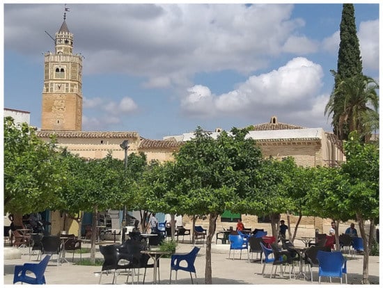 Secondly, a strategy of listing and auditing landmark monuments, construction techniques, has been undertaken. The city has a very important Moorish legacy. A series of heritage elements remain today in Testour, the most remarkable village in the whole area for its cultural and agricultural heritage, with its traditional center and surrounding landscape as a unique example of urbanization, architectural vocabulary, and special typologies among all the other Moorish canters. Elements of great historical importance and identity for the population could become an engine of local development and cooperative governance through proper management of its heritage, as well as tourist, cultural, and economic exploitation. Figure 10 presents one of the most important urban and architectural components of the city: the public place and the Great Mosque.