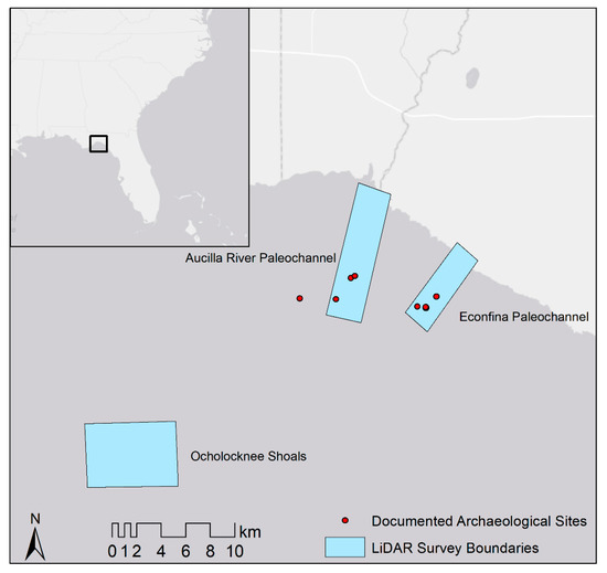 Between 2016 and 2022, bathymetric LiDAR surveys of the Apalachee Bay were commissioned by the Aucilla Research Institute. The areas encompassed three areas of archaeological interest: the Aucilla River paleochannel, the Econfina River paleochannel, and Ocholocknee Shoals (Figure 1). The Aucilla paleochannel was targeted because it encompasses multiple documented submerged terminal Pleistocene to middle Holocene sites [33,34,35,60]. The Econfina paleochannel was targeted because it also contains documented submerged, pre-contact archaeological sites and locales but no occupations older than middle Holocene [33,34,35,43,45,46]. Both paleochannel systems were chosen to operate both as controls (due to the presence of known archaeological sites) and high probability areas for additional archaeological prospection on the shallow continental shelf.