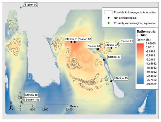 For example, our surveys in Ocholocknee Shoals demonstrate that maritime contexts with high energy flow and rates of sedimentation result in poor conditions for LiDAR to identify buried cultural contexts. The discovery of possible lithic artifacts at Station 9 (Figure 2 and Figure 3; Table 2) requires follow up testing and visitation, but they appear to be the exemption that proves the rule—this was the one location with thinner sediment cover and also the only location visited in the Ocholocknee Shoals where we encountered potential archaeological remains. Additionally, the presence of freshwater sources (which appear as sinkholes in the data) are clearly defined in bathymetric LiDAR datasets and can be used as a potential proxy for human settlement given known regional archaeological trends. Taken together, the results from this region were suboptimal, but bathymetric LiDAR was still able to ascertain potential archaeological deposits in areas with thinner sediment cover, and future research can focus on paleochannel and freshwater features that are associated with many submerged sites in this area.