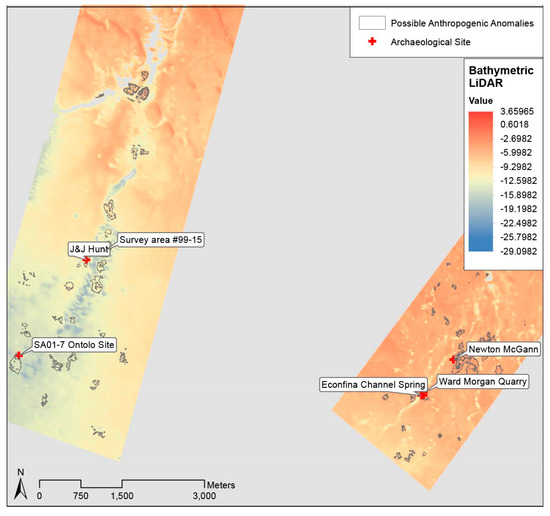 In contrast, conditions in the adjacent Econfina River were more conducive to underwater and bathymetric LiDAR surveys. While eel grass cover is present in both Econfina and Ocholocknee, the rate of sedimentation is lower, with contexts that are less affected by thick sediment deposits. Consequently, a greater number of confirmed archaeological sites have been recorded here, including a new site identified by bathymetric LiDAR in this study (Figure 4). As such, it appears that eel grass cover is not a major hinderance to archaeological surveys using bathymetric LiDAR, but sedimentation rates are.