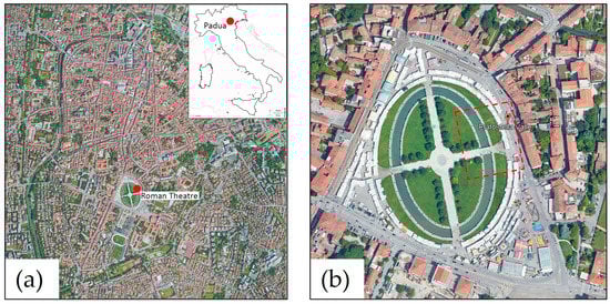 The theatre, built in the southeastern area out of the Roman urban center of Padua (Patavium), probably was affected already at the time of its construction by standing water problems [1]. The old name “Pratum cum Valle” is found as early as 1077. According to the toponymy that is still preserved today, “Valle” probably reminds an ancient depressed area with marshes and swamps, perhaps related to the hydrographic upheaval that interested the Po Valley at the end of the sixth century and to the wetlands documented in this area at the end of the 16th century. From a geomorphological point of view, recent studies established the alluvial nature of the sediments in this area [2,3,4], predominantly silty and clayey [5], also confirming their low hydraulic permeability. Undoubtedly, the regimentation and removal of water, as well as the idea to realize a modern and significant arrangement and enhancement of this area, were at the basis of the intervention, which led Andrea Memmo to want and realize the current arrangement of Prato della Valle [6] in the second half of the 18th century. (Figure 1).