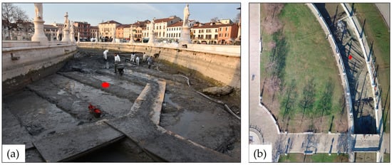 The remains of the Roman theatre were first identified in 1775, during the cited rearrangement of Prato della Valle, when Simone Stratico and Angelo Ciotto thoroughly described and drew the remains today buried below this square [7] consisting of a rectangular structure (probably the stage building) with the semicircular platform at the base of the cavea. After that, only the part standing at the bottom of the canal in Prato della Valle was documented in the 1960s and 1980s during the cleaning of the canal [8]. More recently, in 2017, the same portion of the submerged remains was again brought to light, described and geometrically reconstructed thanks to the excavation project carried out by the University of Padua, the municipality, and the local Superintendence [1,9,10]. This archaeological activity allowed for the detailed analysis of the part of the foundations of the cavea still preserved below the canal (Figure 2), consisting of a concrete foundation platform (about 2.4 m in thickness), five semicircular structures, and ten partially visible radial walls [10].