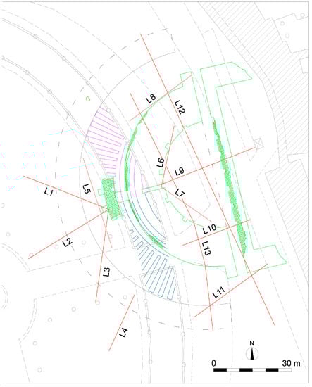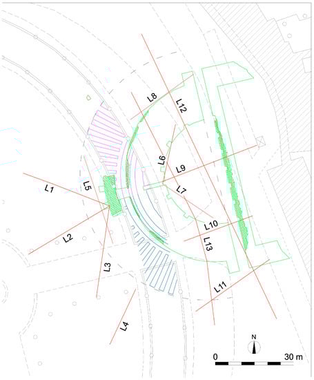 To verify the right location and extension of possible remains of the Roman theatre in Prato della Valle in the area identified by the analysis of historical cartography, several ERT and GPR sections were planned (Figure 4): five overlapping GPR and ERT sections (L1–L5 in Figure 4) in the inner green area, two more GPR and ERT sections (L6–L7 in Figure 4) in the outer green belt, and six more GPR sections (L8–L13 in Figure 4) to the East between the outer green area and the asphalt.