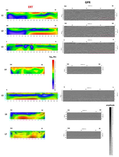 L1, L2, L3, and L5 ERT lines were performed with a roll-along acquisition [37], overlapping 24 electrodes on two consecutive 48-electrode lines totaling 35.5 m in length. L4, L6, and L7 used only 48 electrodes for a 23.5 m total length. The same maximum survey depth achieved for all these configurations is less than 5 m. For ERT data inversion, we used the ProfileR software, based on the Occam approach [38]. Data pre-processing consisted of rejecting values that exceeded the quality factor considering direct and reciprocal measurements. This process implied a loss of approximately 10% of data points but ensured the maximum control for the data used in the inversion process. To allow adequate comparison between the different sections’ anomalies, we finally adopted the same log10 resistivity range (0–2.3 log10 Res), plotting the results with Golden software SURFER 15.