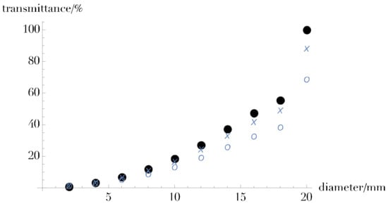 Figure 4 shows the increase in transmission with the increase in the diameter of the aperture. Note that for apertures smaller than 6 mm in diameter, the transmission through glass has minimal influence on the final transmission. The diameter plays the major role.