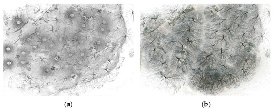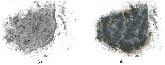 For the comparative analyses, we chose an area with good data coverage in both scans. Distant points were excluded from the research scope—they were significantly present in the TLS data, as the scan range was larger and cloud cleaning was not performed. A “cutting-out box” with the dimensions of 60 m × 49 m was defined for the point clouds. After this operation, the TLS point cloud was reduced to 54,296,119 points and 798.8 MB; the MLS point cloud was reduced to 94,179,774 points and 2.86 GB. The result of the cut area in each point cloud can be seen in the orthoimages of Figure 3.