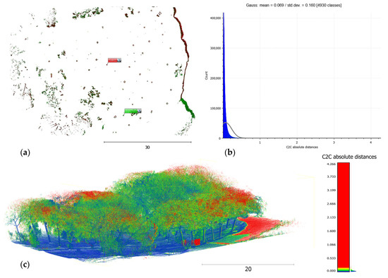We proceeded to compare the point clouds in their entirety. We performed a cloud-to-cloud comparison to verify the absolute deviation. The Faro point cloud was set as the reference scan from which the BLK2GO data deviation was calculated. The average error value was 69 mm, as shown in Figure 4b. The maximum error value (in red) is located on the crowns (Figure 4c). This result was expected as this part of the trees moved during data acquisition. Other red areas were identified where the Faro dataset lacked points or the BLK2GO point cloud showed details of the operator moving across the site.