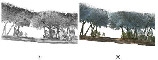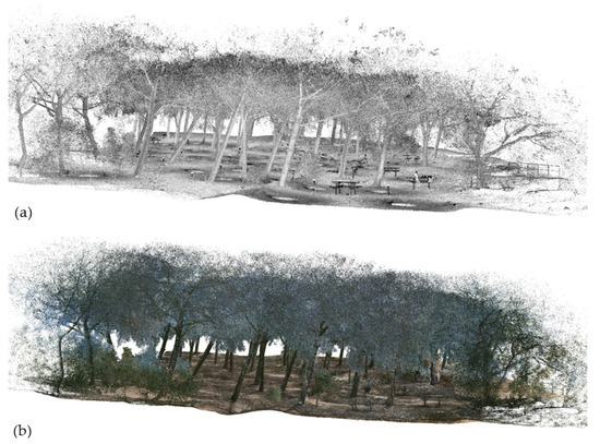 For the first analysis, the point clouds were dissected along longitudinal and transversal planes, intersecting each other at the center of the clouds. The visualization was adjusted to the cross-sections of the planes, and the information beyond the planes was retained. The objective was to visually verify the quality of the two clouds in the zones with better data capture (a centralized area of the study object) and with greater canopy coverage. One of the first features that stands out is the more realistic appearance of the BLK2GO cloud, mainly due to the application of color (Figure 5).