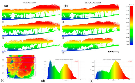 We set a common scalar field for the representation of the z-values, and we applied it to the three sections. The three sections reach all the same values in height. The histograms in Figure 6 show that the 99.99% is lower than 13.72m for the entire Faro dataset and 13.97 for the BLK2GO dataset.