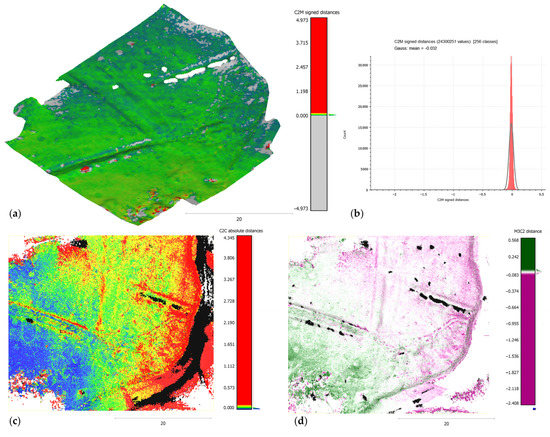Figure 7. Terrain data comparison. (a) Cloud-to-mesh comparison between the reference data (Faro Focus point cloud) and the Digital Terrain Model generated from the segmented terrain cloud acquired with the Leica BLK2GO scanner. (b) Histogram describing the deviation distribution. (c) Cloud-to-cloud comparison; Faro Focus 3D point cloud is set as reference data. (d) M3C2 cloud-to-cloud Z-distance analysis.