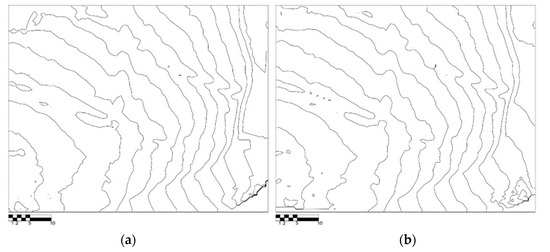 Figure 8. Contour lines every 50 cm are obtained from the Faro Focus’s point cloud (a) and BLK2GO’s (b).