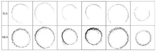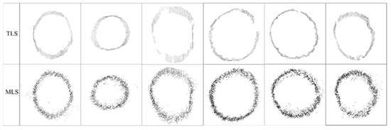 Figure 10. Horizontal sections of the trees on the periphery area obtained by TLS and MLS. Although there is more noise, MLS is able to better define the sections in less scanning time.