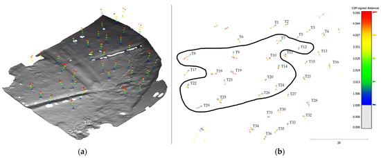 A thought on the results of the C2C analysis (Figure 7c) is also necessary. It shows the absolute distances between the two datasets of the terrain, from blue (low) to red (high). The areas where the Faro point cloud had a lack of data are in black, and so the comparison was not possible. The areas in proximity to the black ones, in which the scalar field was generated by interpolation of points contained in a local neighborhood, are also shown in red. So, the high values of error shown on the scalar field of the C2M analysis, near to those where the Faro dataset lacked points, are the result of poor interpolation, and they can be overlooked.