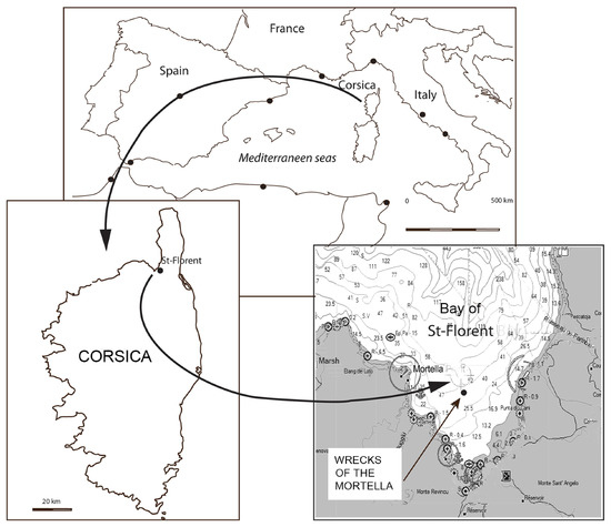 The Mortella II and III wrecks were discovered during a geophysical survey program led by the Centre d’Etudes en Archéologie Nautique—CEAN—(Center for Nautical Archaeology Studies) between 2005 and 2009 in the Gulf of Saint-Florent (Corsica, France). This survey, which combined acoustic and magnetometric detection techniques, led to the discovery of the two shipwrecks dating from the 16th century. The first, named Mortella II, was located in October 2005 at a depth of 47 m at the exit of the bay. The second, named Mortella III, was discovered in November 2006 at a depth of 38 m, 650 m south-east of the first [1] (Figure 1).