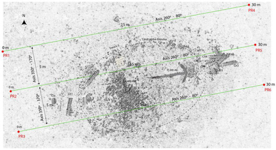 An initial evaluation to the arrangement of the site was made at the time of its discovery in 2005, thanks to analysis of its SONAR image. This revealed an archaeological complex with a central tumulus made up of gravel and ballast stones extending over 28 × 15 m, i.e., slightly more than 400 m2 (Figure 5). The frequency of the acoustic waves (800 kHz) enabled sufficient penetration of the sediment to distinguish a regular and curved line of concretions on its northern slope, which seemed to mark the limits of the surviving hull (red line in Figure 5). Its measurements are 25 × 7 m, with a longitudinal axis oriented 260–80°.