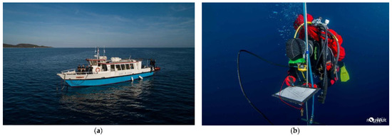 To ensure optimum safety of the operation, and taking into account the nitrogen accumulation in human tissues, it was decided to limit the procedures to one 25′ dive per day with oxygen decompression (Figure 3b). The dredge was supplied by a high-pressure water pump (5 bars—60 m3/h) located on the U Saleccia, our base operation boat (Figure 3a).