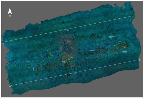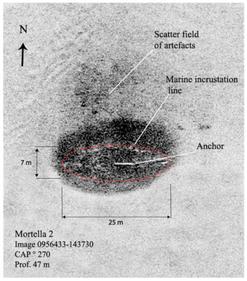 The lower degree of the hull inclination of the Mortella II ship, as observed in the S trench, indicates a probable slant of the wreck on its northern side, to an extent that remains undetermined but certainly greater than 15°. This layout is consistent with the presence of a scattered artefacts field visible on the SONAR image on its northern slope (Figure 5).